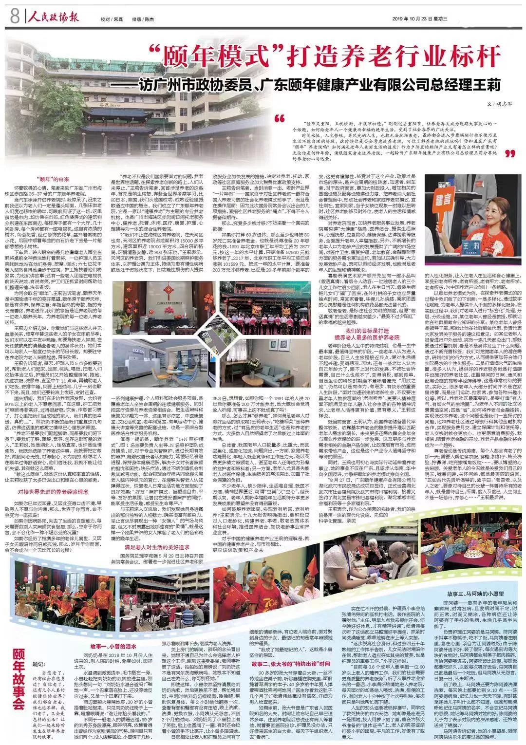 2019年10月23日,《人民政協(xié)報(bào)》媒體整版刊登《“頤年模式”打造養(yǎng)老行業(yè)標(biāo)桿——訪廣州市政協(xié)委員、廣東頤年健康產(chǎn)業(yè)有限公司總經(jīng)理王莉》,權(quán)威解讀頤年養(yǎng)老院的獨(dú)特養(yǎng)老模式!